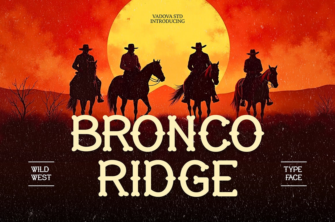 Bronco Ridge is a cowboy-style typeface inspired by the rugged charm of the Wild West, featuring bold, rustic letterforms that make it perfect for western-themed branding, vintage posters, saloon signs, rodeo flyers, and rustic apparel designs.