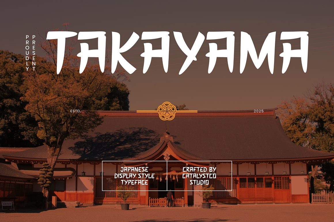 TAKAYAMA is a sharp, refined display typeface deeply rooted in traditional Japanese aesthetic while shaped for the modern creative market. The style is bold and structured, evoking a sense of strength, heritage, and architectural grace. It carries a clean yet ceremonial presence, reminiscent of ancient temples, torii gates, and cultural symbolism. This font channels a grounded and spiritual energy, making it suitable for designers and creators seeking a refined, culturally rich identity. Fits seamlessly into brand worlds that want to communicate depth, tradition, and minimal elegance — think luxury skincare, artisan tea packaging, travel magazines, restaurant logos, and cultural event posters.